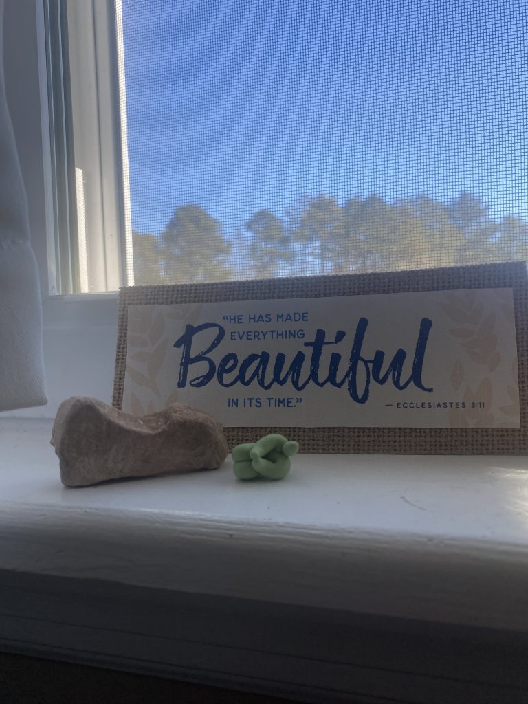 So much. It’s so much, and you might feel today like this little man who sits on the windowsill above my desk. He usually perches atop his little mountain, praying and having his own experience of God. (I imagine so, anyway.) The other day, though, he just couldn’t hold on any longer.